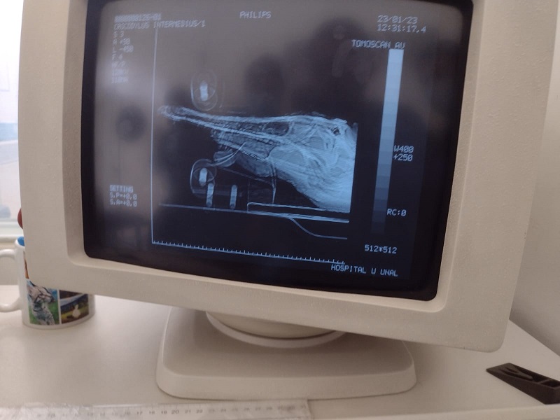 El profesor Henry Meneses, experto en tomografía, fue el encargado de dirigir todo el procedimiento de escaneo. El equipo médico hizo el seguimiento respectivo de las imágenes y fue tomando nota tanto de tejidos blandos como duros. El procedimiento tardó alrededor de dos horas, en las cuales se fueron registrando en el computador -centímetro a centímetro- todos los detalles de la tomografía realizada. “En un país como el nuestro, con una especie de esta dimensión, que está a punto de desaparecer no por causas naturales, sino por la acción del hombre, lo mínimo que podemos hacer es conocerla al máximo”, menciona el profesor Moreno. Y agrega que procedimientos como la tomografía permiten definir todos los aspectos fisiológicos y patológicos intrínsecos a estos animales.