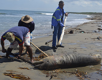 Un delfín que murió posiblemente arrastrado por las corrientes del último ciclón que pasó por el mar Atlántico, fue enterrado por un grupo de pescadores en las playas de Punta Roca, sector de Sabanilla, Salgar, en el Atlàntico, hasta donde llegó este ejemplar. El procedimiento se realizó para evitar contaminación en el sector.